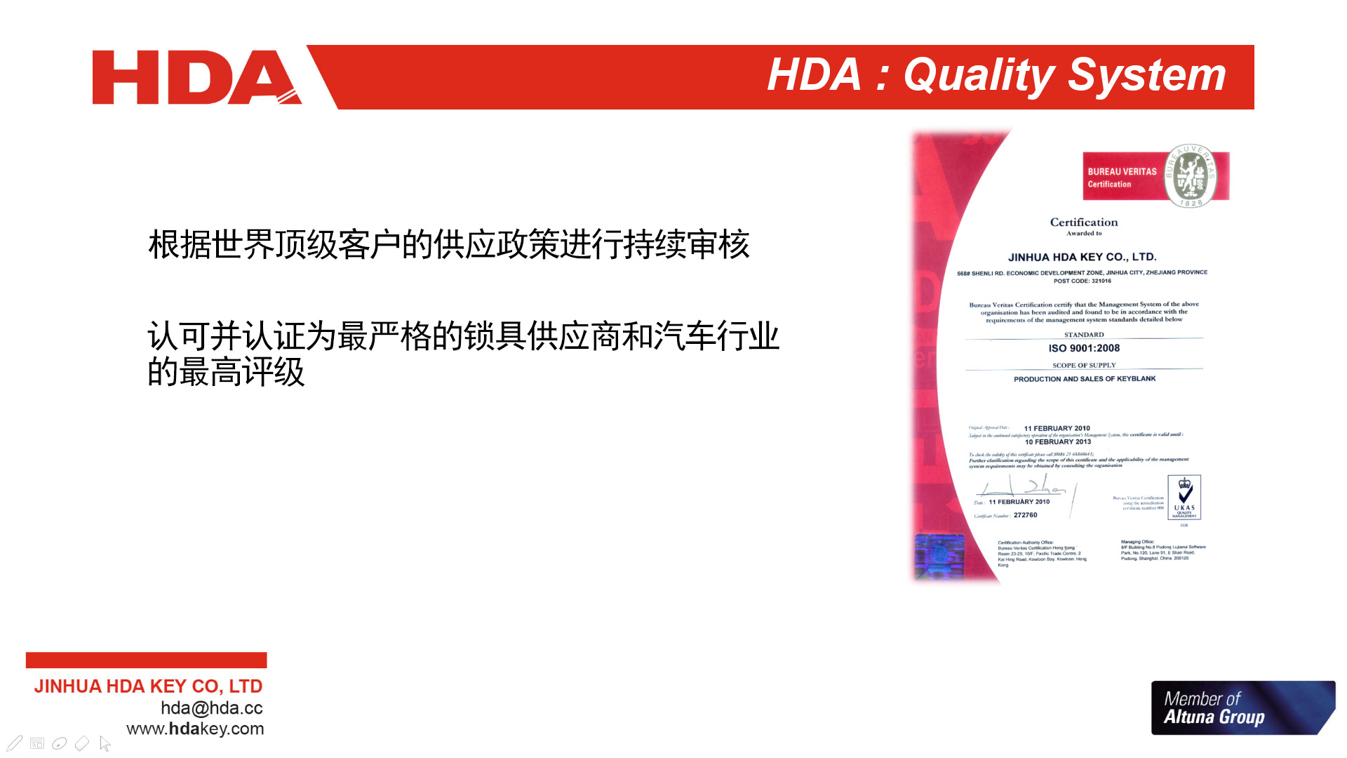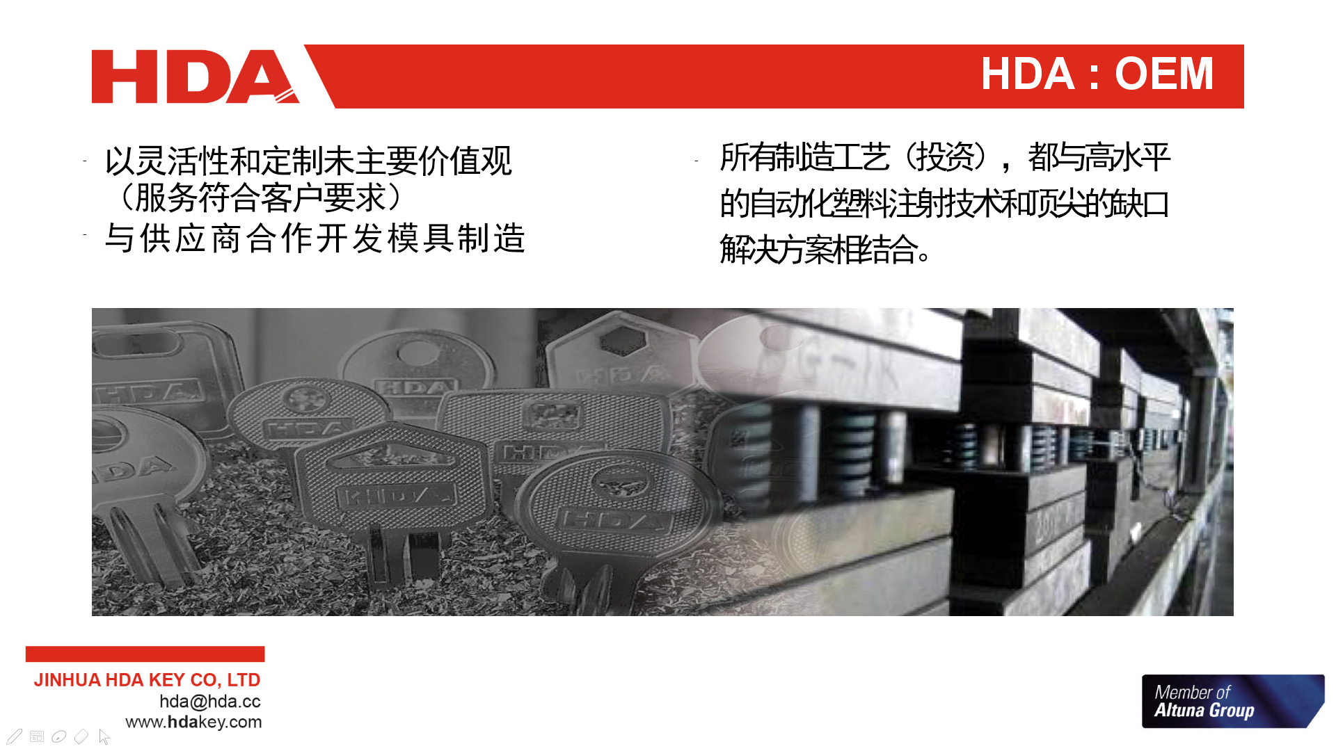 2005年,與歐洲三大鑰匙坯生產(chǎn)企業(yè)之一的西班牙JMA集團成立合資公司--金華HDA鑰匙有限公司。 2007年,轉(zhuǎn)為西班牙JMA集團獨資子公司。